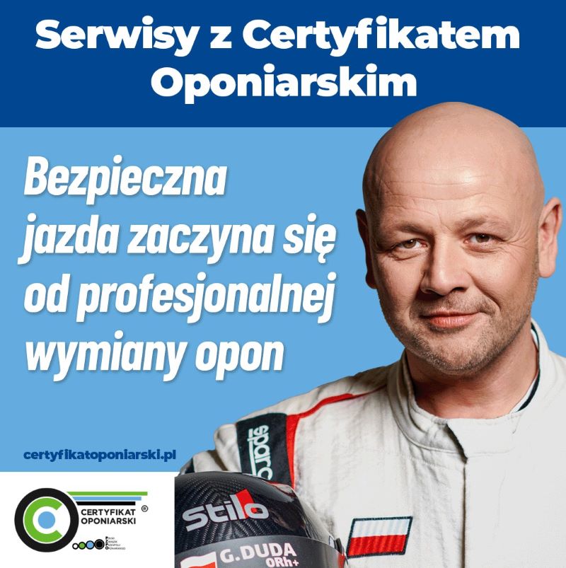 W całej Polsce można znaleźć tablice wskazujące serwisy z Certyfikatem – to kampania wspierana przez Grzegorza Dudę – kierowcę rajdowego i dziennikarza motoryzacyjnego, a przy tym inżyniera-mechanika samochodowego, który dokładnie wie, jak wielki wpływ ma jakość opon i prawidłowy serwis na bezpieczną jazdę.